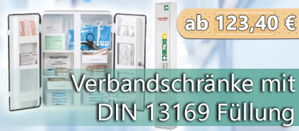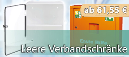 Der Erste Hilfe Schrank oder auch Verbandsschrank genannt ist die repräsentative Alternative zum Erste-Hilfe-Koffer. Unsere Erste Hilfe Schränke sind extrem schlagfest und robust. Sie sichern den Inhalt durch ein Schloss. Mit den Einlegeböden im Erste Hilfe Schrank sind Ihre Verbandmaterialien aufgeräumt und mit ausreichend Platz verstaut. So wird schnell die passende Wundversorgung gefunden. Unsere Erste Hilfe Schränke liefern wir entweder leer, so dass Sie Ihre individuell zusammengestellten Verbandsstoffe unterbringen können oder Sie nutzen die Verbandsschränke die wir Ihnen mit der Grundausstattung nach DIN 13157 oder DIN 13169 liefern. Unsere Verbandschränke ohne Füllung sind auch als Medizinschrank geeignet.