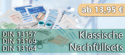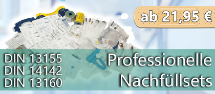 Unsere Austauschsets für Ihre Erste-Hilfe-Ausrüstung entsprechen der aktuellen DIN 13157 und DIN 13169. Für einen einfachen Austausch von Verbandstoffen sind die Bestandteile der Nachfüllsets einzeln hygienisch verpackt. Achten Sie darauf, dass Sie die Verbandmaterialien in Ihren Erste-Hilfe-Koffern regelmäßig auf Vollständigkeit und Haltbarkeitsdatum prüfen. Benötigen Sie gar keine kompletten Nachfüllsets für Ihre Erste-Hilfe Koffer, sondern wollen nur Nachfüllmaterialien ergänzen oder austauschen, finden Sie sämtliche Verbandmaterialien in unserer Rubrik Einzelkomponenten.